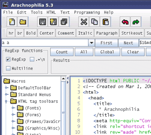 Arachnophilia является бесплатным редактором, который был впервые опубликован в середине 90s. Инструмент является мощным редактором с рядом специальных характеристик для создания и редактирования HTML. Редактор содержит RegExp функции и функциональность для сравнения текста. Он не предлагает нечто революционное, но он кросс-платформенный. Последняя версия 5,3 был выпущена в марте 2008 года.