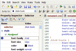 Вы можете также использовать CSS Property редактор с поддержкой динамических свойств и Selector Constructor - удобный мастер для сложных селекторов и различных инструментов кода, например, Expanding/Extract URLS, Convert Colors, Convert Code и так далее. Можно просматривать селекторы, свойства, комментарии и @-правила и добавлять / удалять HTML, такие как HTML-комментарии и CDATA секции. Цена: $ 39,95. Доступна trial-версия.