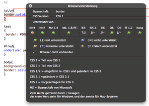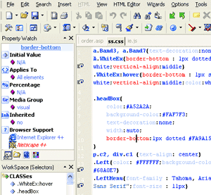 Редактор имеет IntelliSense технологию (для стилей и HTML) с быстрой справкой по CSS. Property Watch автоматически определяет CSS-свойство (или HTML-тег, если вы редактируете HTML-документ) и выводит полную информацию о нем.