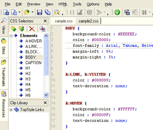 CSS и HTML-редактор TopStyle доступен в ее Lite-версия вместе с HTML-редактором Homesite - впрочем, есть также более сложная полная версия для профессиональных веб-разработчиков. С TopStyle разработчики получили ряд особенностей, которые недоступны в других редакторах. Например, со встроенным HTML-tidy вы можете легко перевести HTML-теги в XHTML стиль. Таким образом, заменяются теги, такие как <font>- на тег с соответствующими валидными CSS-правилами. Библиотека содержит подборки часто используемых фрагментов кода. Разбитие окна дает возможность напрямую сравнивать представление сайта в Internet Explorer и Mozilla. Вы можете также изменять Doctype-определение, с тем чтобы выяснить, каким образом различные DTDs влияют на верстку в разных браузерах.